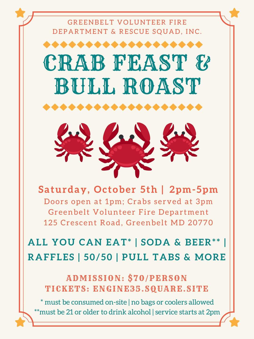 The Greenbelt Volunteer Fire Department’s annual Crab Feast & Bull Roast Fundraiser. Featuring all you can eat (on-site only, NO BAGS-NO COOLERS) steamed crabs, pit beef, crab soup, corn on the cob, hot dogs, baked beans, coleslaw, sodas and beer (must be 21 to consume | complimentary service starts at 2pm). Also featuring 50/50 raffle, pull tabs, liquor wheel, and other games. Doors open at 1pm, buffet opens at 2pm, and crabs at 3pm. No reserved seating or saving seats.